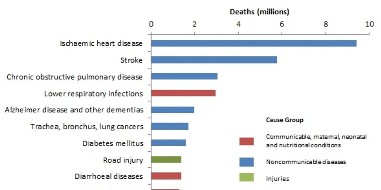 According to the World Health Organization (WHO), the top 2 causes of death globally have been heart disease and stroke for the past decades. Interestingly about 50-60 million people on average die each year, with the top 10 causes of death accounting for over half of those deaths. Also interestingly noted are the disparities (graph below) among causes of death between the low-middle-high income areas. The top 10 causes of death are (Click here for table that includes risks and prevention factors for each):